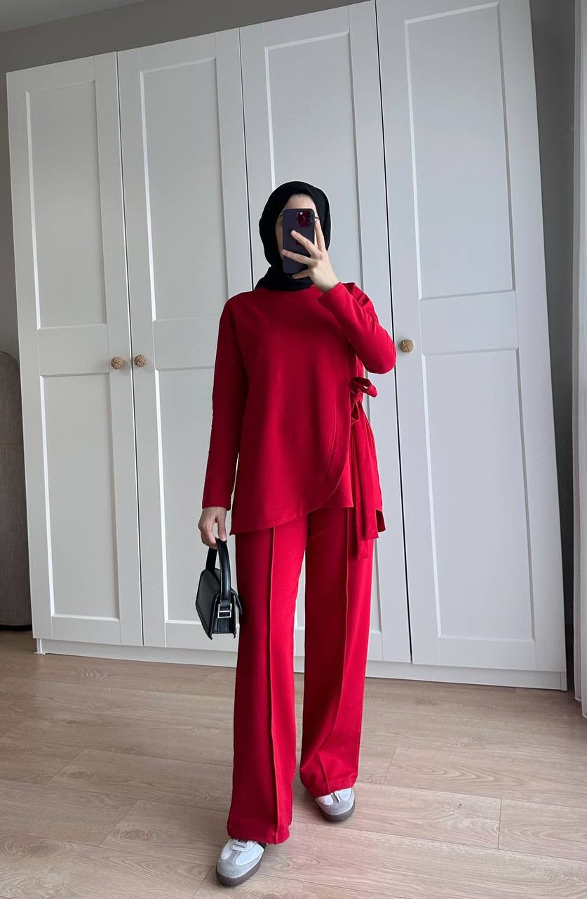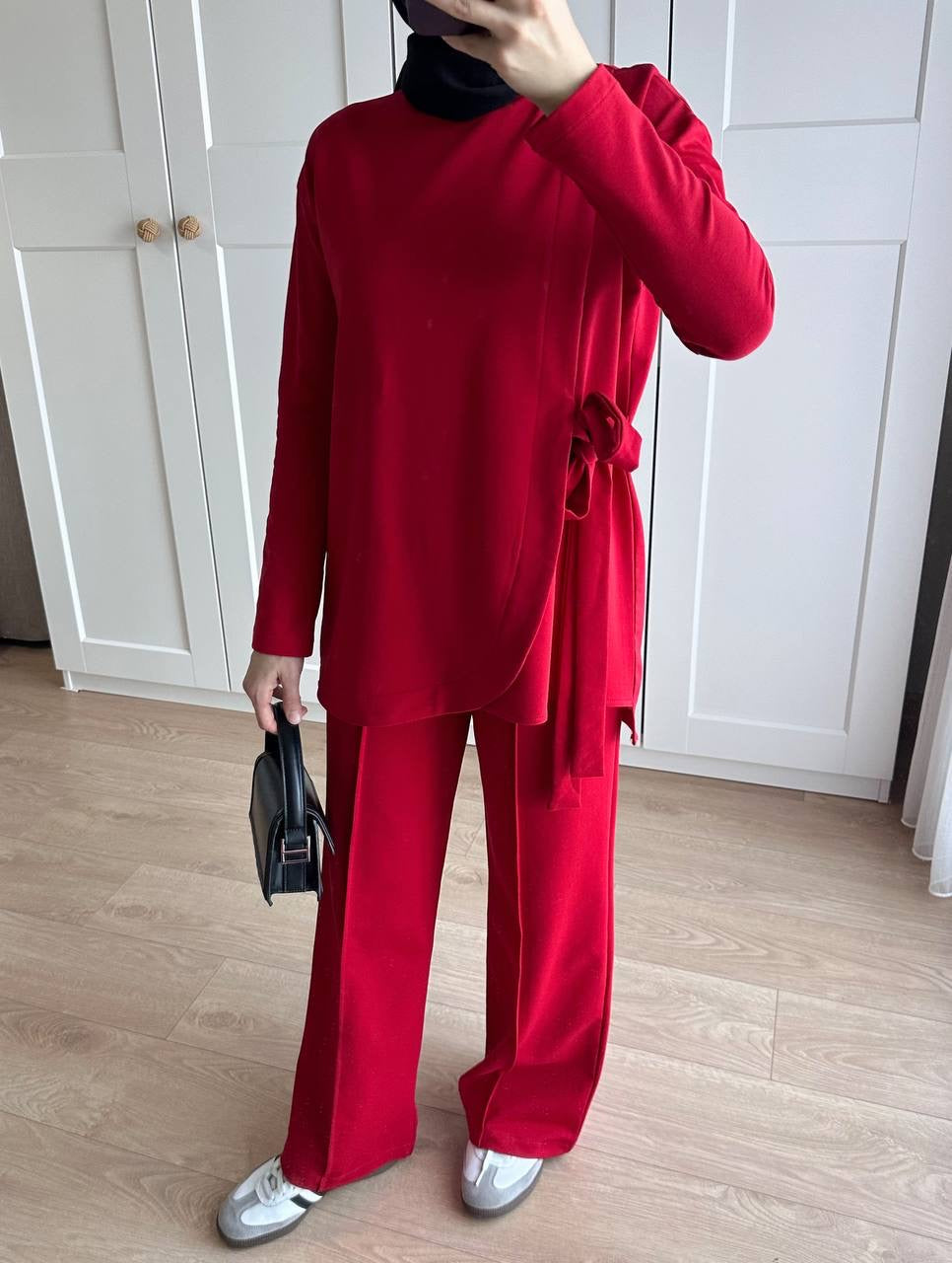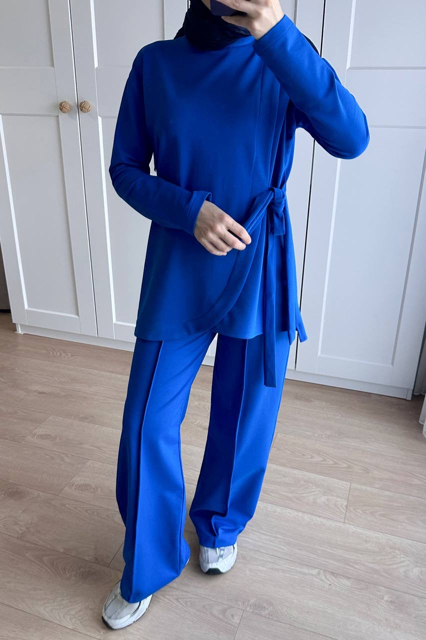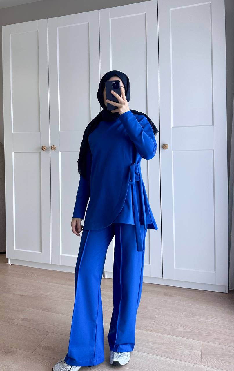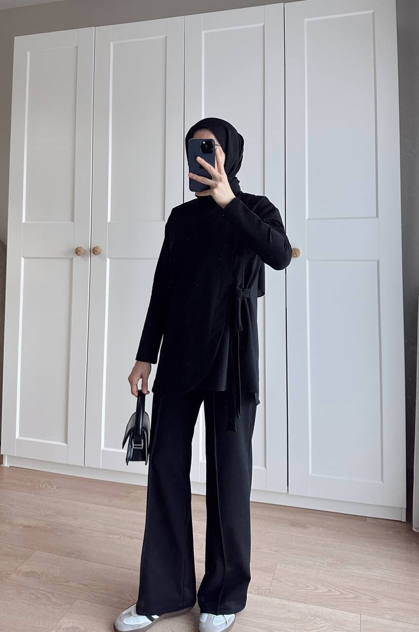 This stylish and comfortable modest set is perfect for any occasion. It features a long-sleeve tunic with a unique wrap detail and a side tie, adding a touch of elegance while maintaining full coverage. The matching wide-leg pants are designed with a relaxed fit, making them both chic and comfortable for all-day wear.