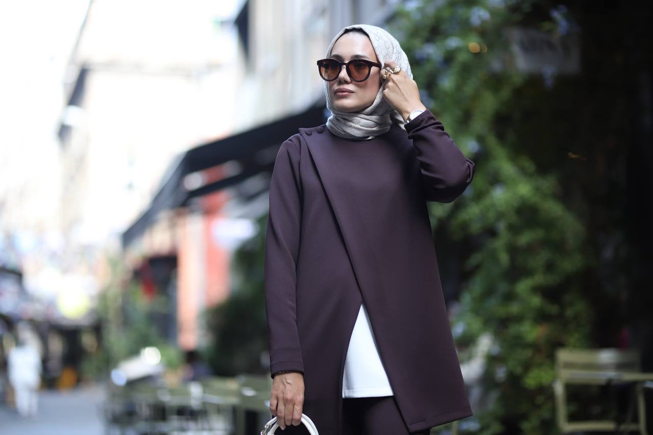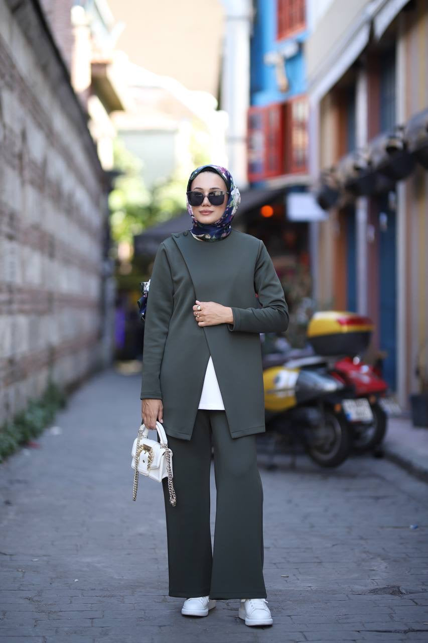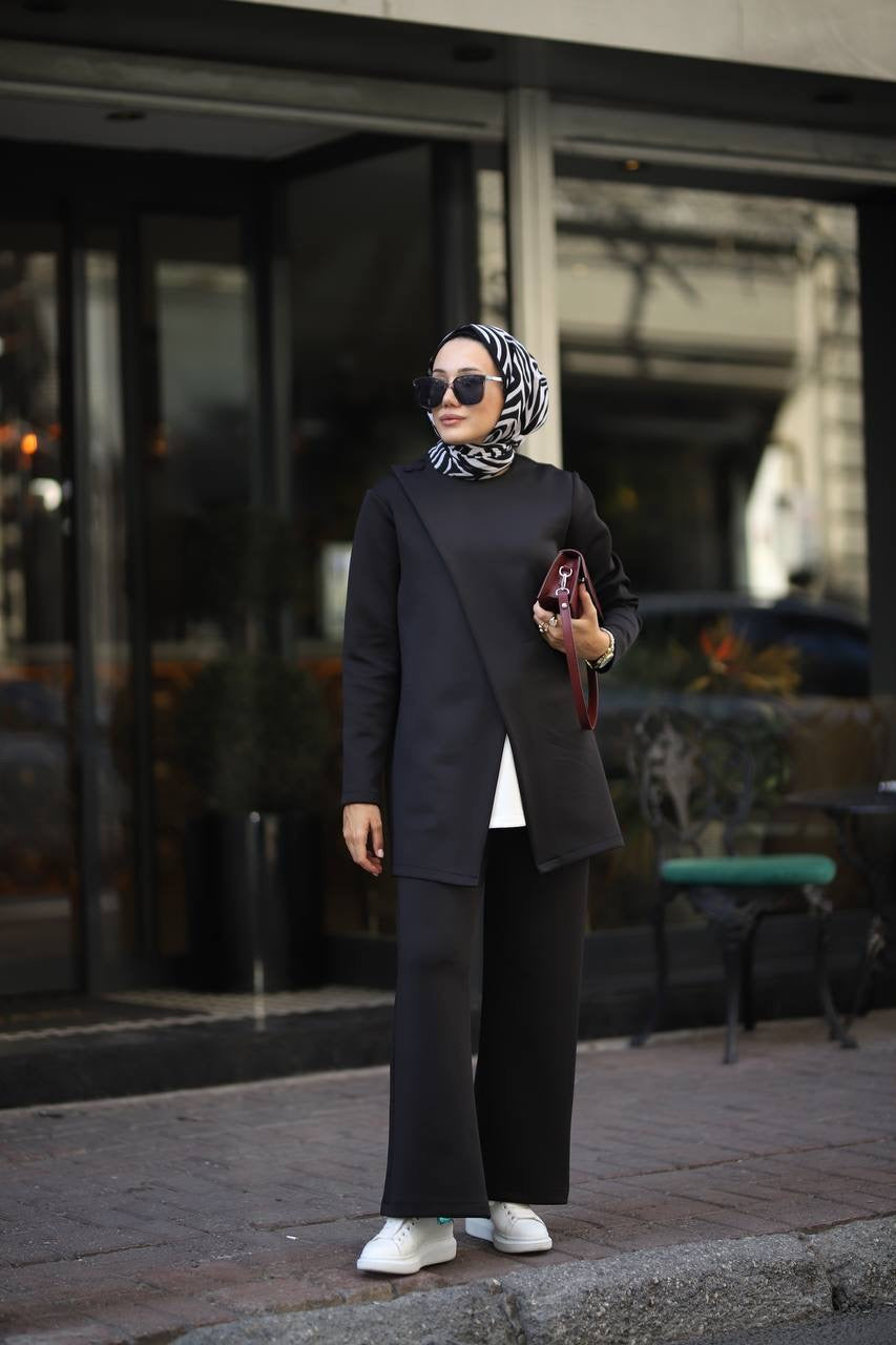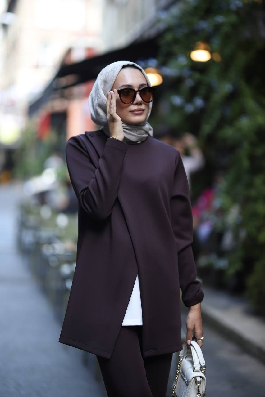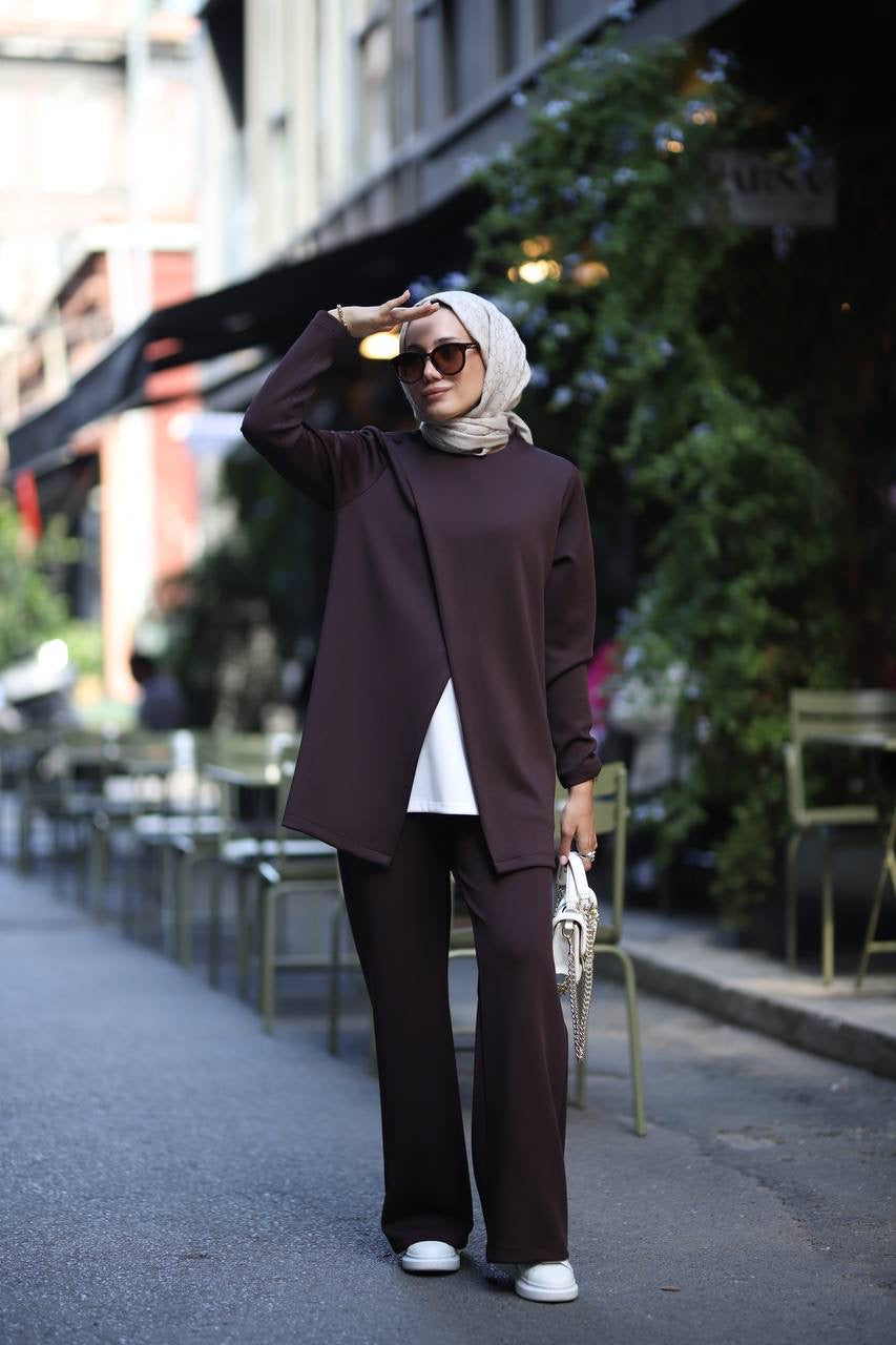 Refined and elegant, our three-piece modest set in rich colors offers a perfect blend of comfort and sophistication. This set includes a chic open-front top, wide-leg pants, and a versatile inner layer, making it a staple for any modest wardrobe. The relaxed yet tailored fit ensures a flattering silhouette, while the soft, premium scuba fabric provides comfort and breathability.