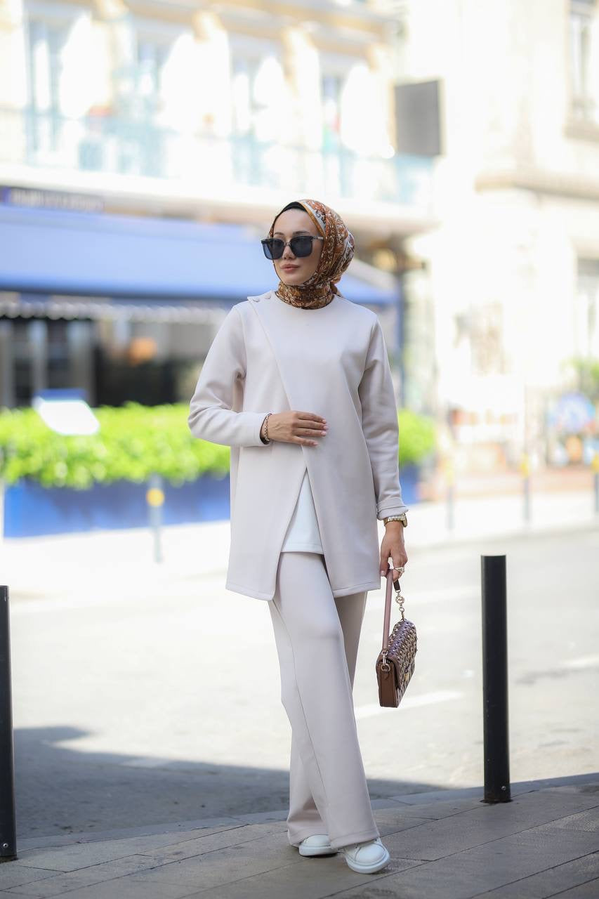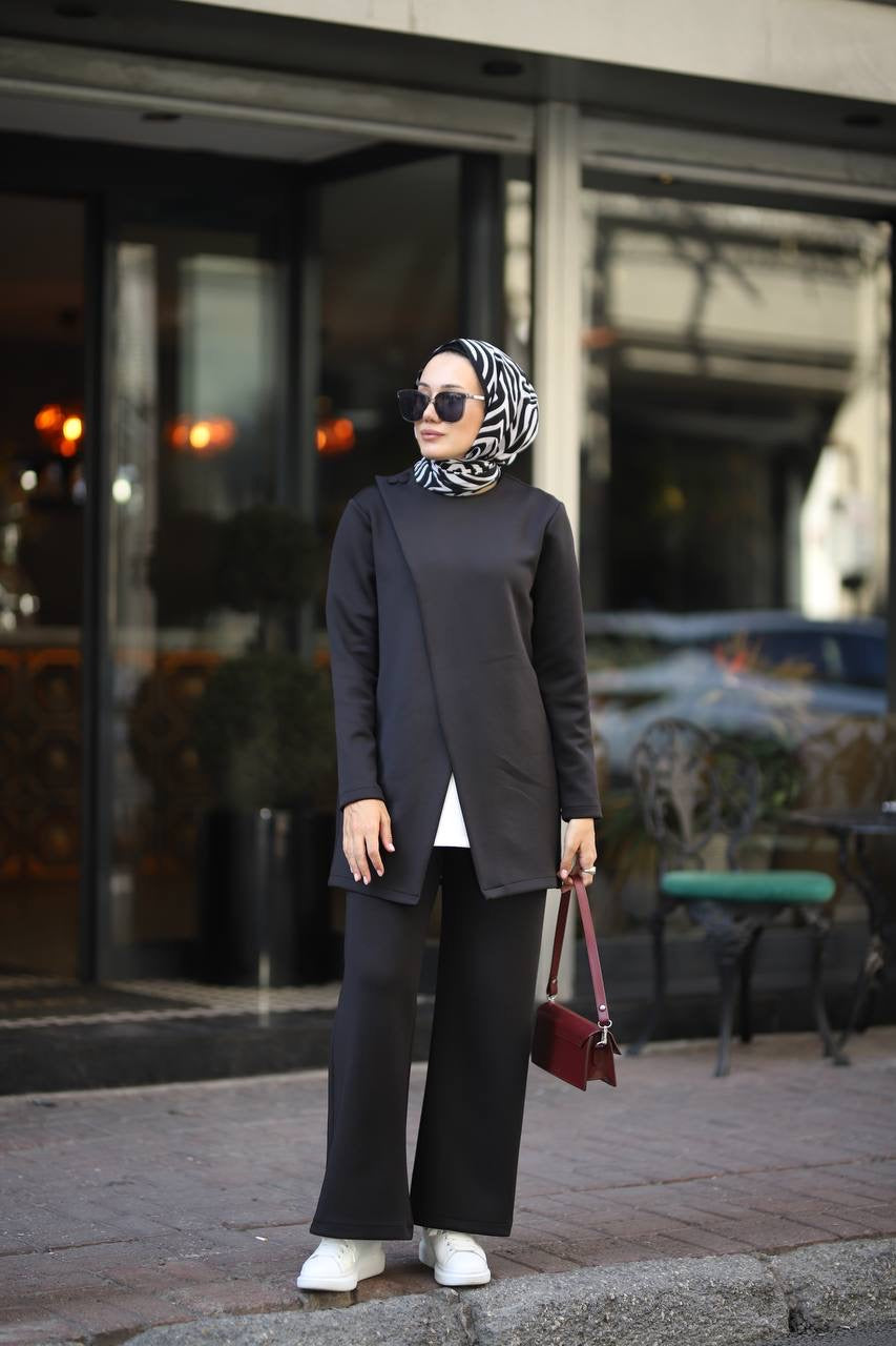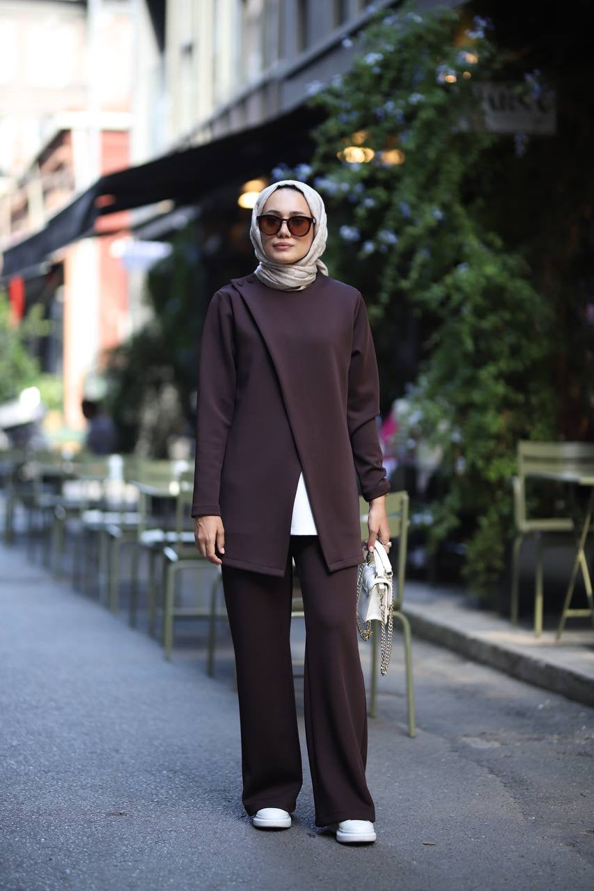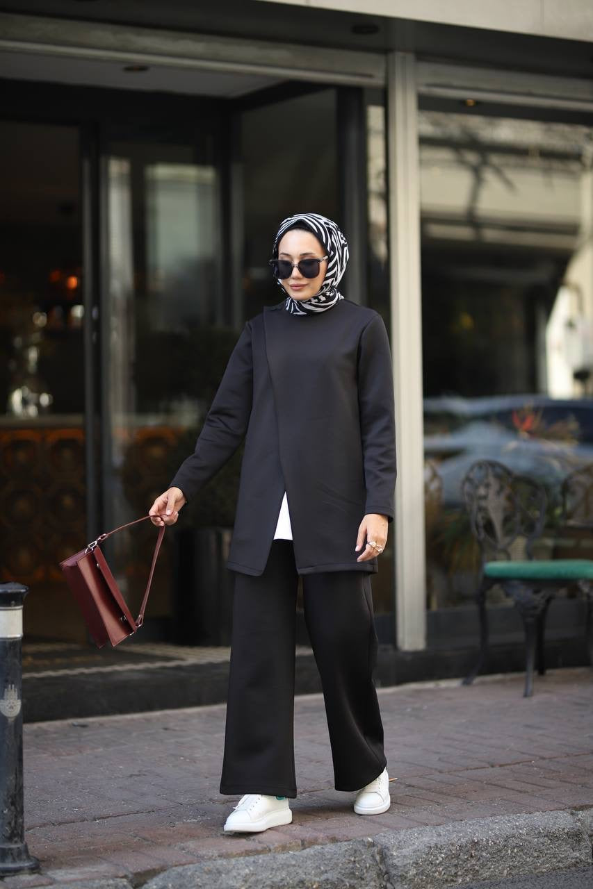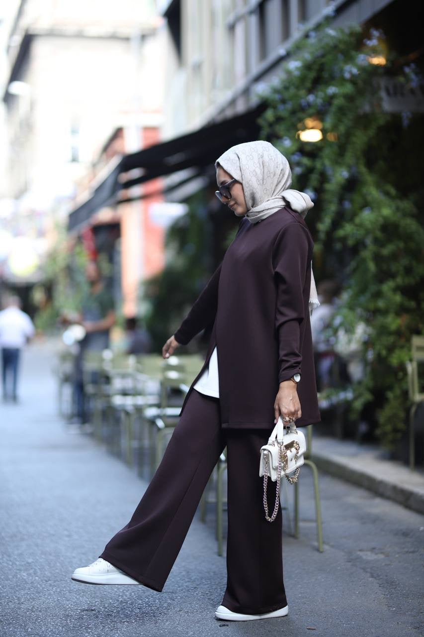 Refined and elegant, our three-piece modest set in rich colors offers a perfect blend of comfort and sophistication. This set includes a chic open-front top, wide-leg pants, and a versatile inner layer, making it a staple for any modest wardrobe. The relaxed yet tailored fit ensures a flattering silhouette, while the soft, premium scuba fabric provides comfort and breathability.