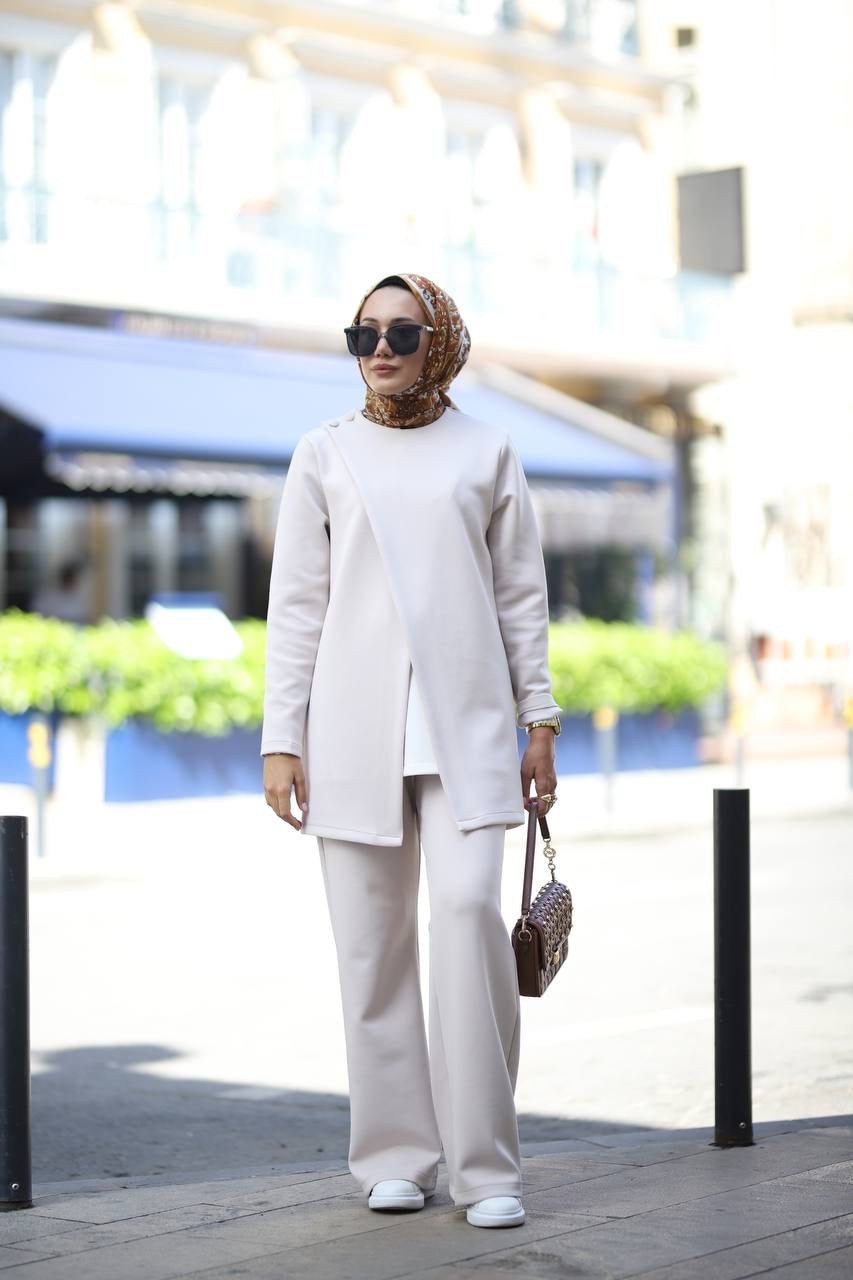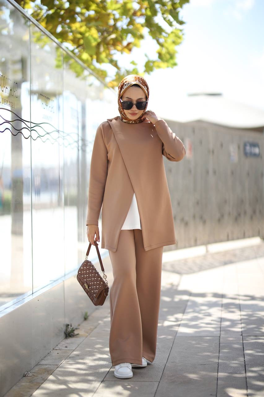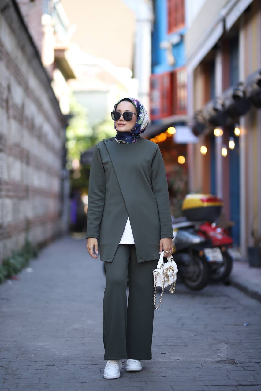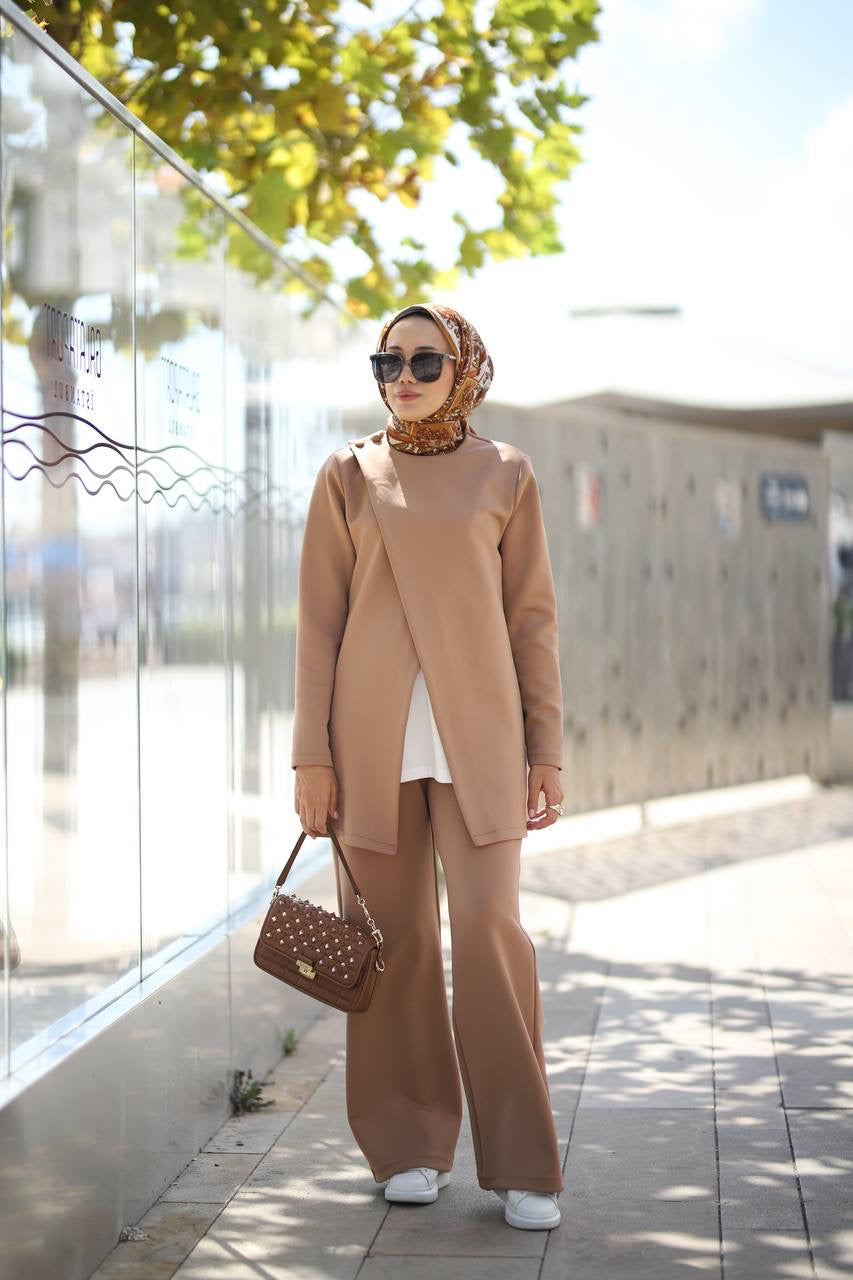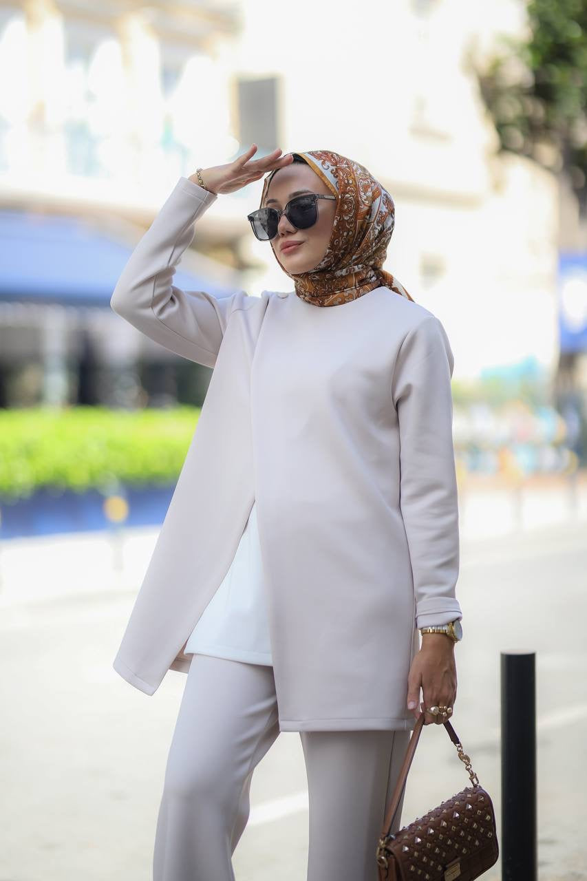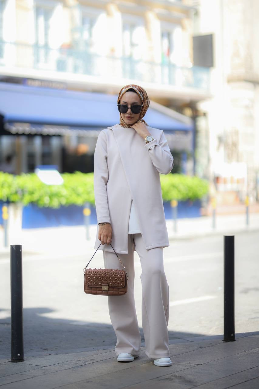 Refined and elegant, our three-piece modest set in rich colors offers a perfect blend of comfort and sophistication. This set includes a chic open-front top, wide-leg pants, and a versatile inner layer, making it a staple for any modest wardrobe. The relaxed yet tailored fit ensures a flattering silhouette, while the soft, premium scuba fabric provides comfort and breathability.