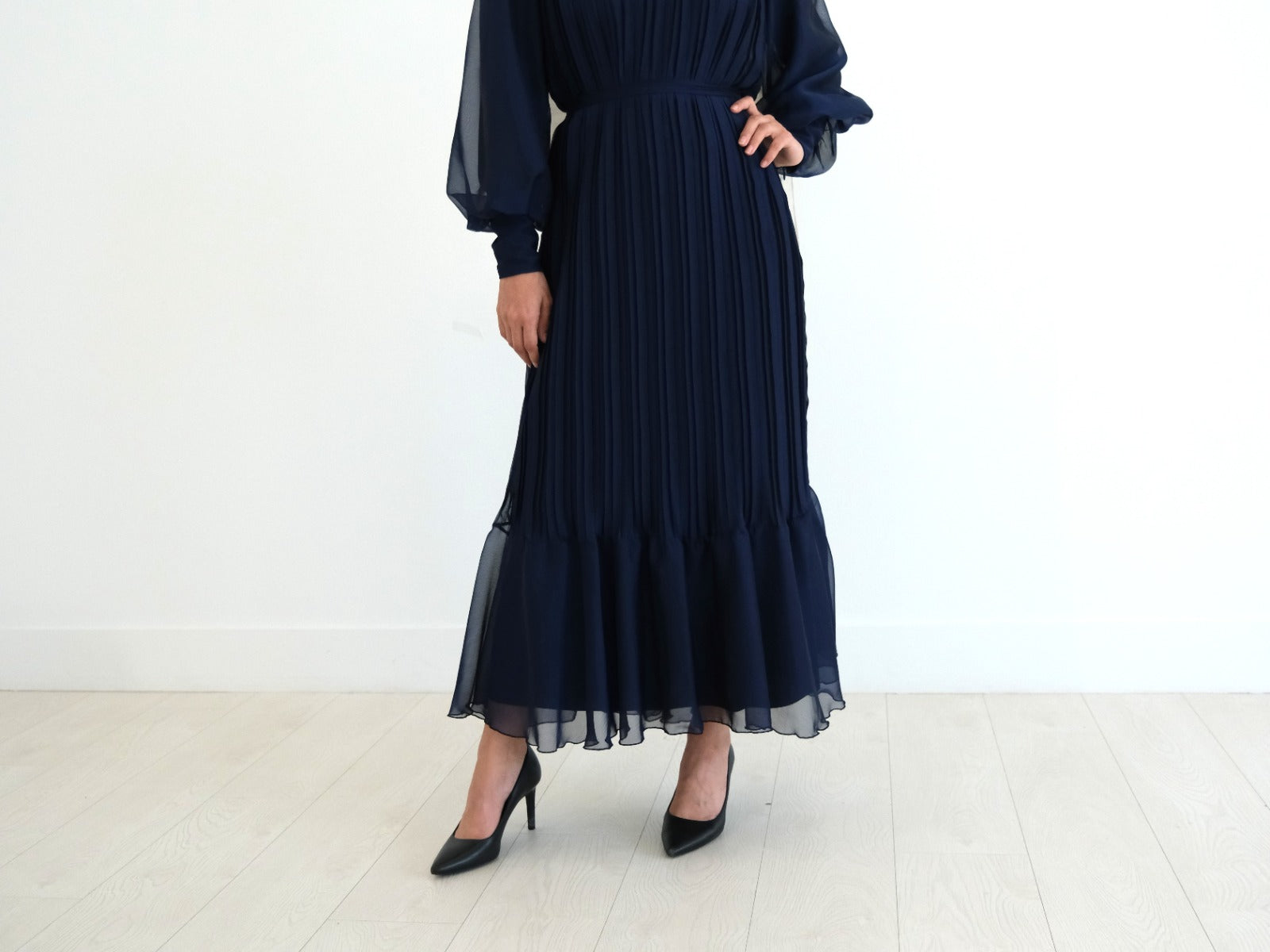 This timeless pleated dress is designed for effortless elegance. Crafted from lightweight organza fabric, it flows beautifully with every step while ensuring full coverage with its soft full lining. The classic straight-cut silhouette is complemented by a detachable belt, allowing you to adjust the fit to your preference. Sheer, fully lined, balloon sleeves add a touch of sophistication, finished with elasticized cuffs for a comfortable fit.