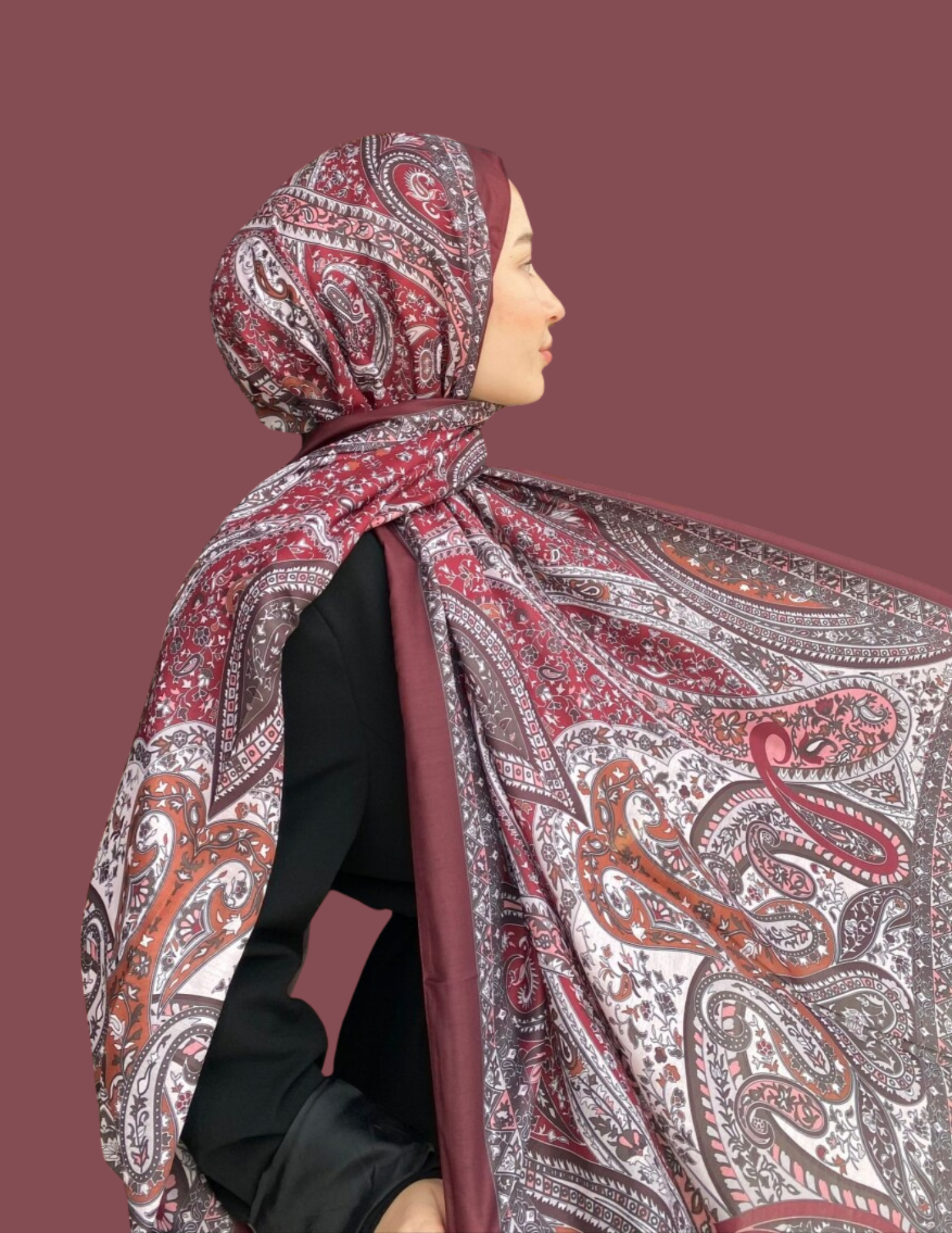 Make a bold statement with our Crimson Paisley Luxe hijab — a rich, intricate print in deep wine, cocoa, and burnt rust tones. Crafted for both beauty and comfort, this hijab features wrinkle-resistant fabric that’s incredibly easy to shape and drape, whether you’re styling it as a light single layer or doubling up for fuller coverage. Finished with fine Italian stitching on all four sides, it offers a luxurious, refined look for any occasion.