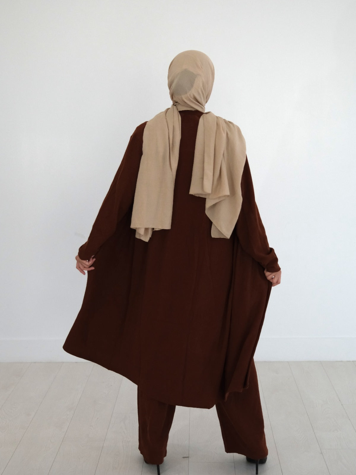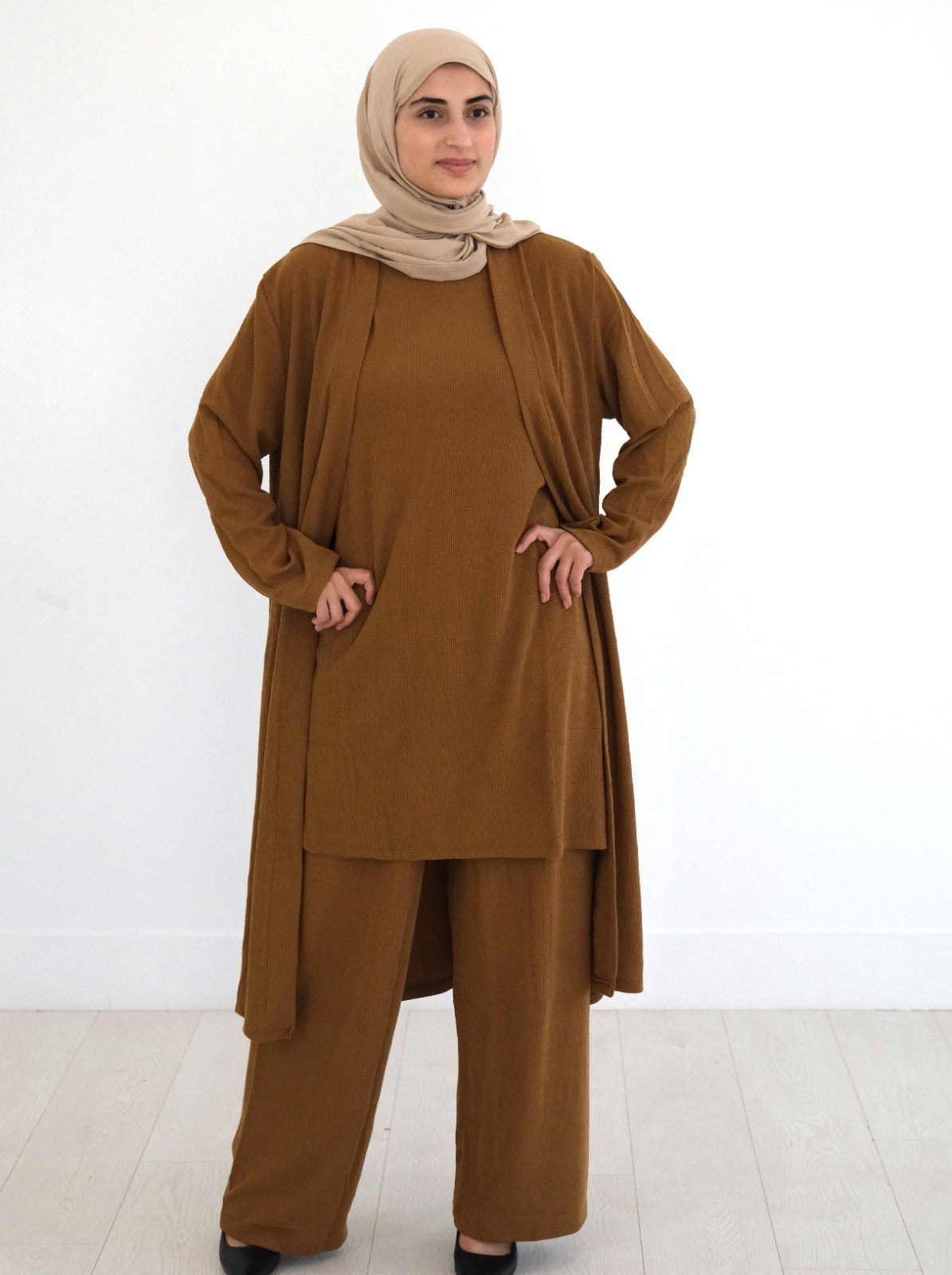 Meet the ultimate modest wardrobe essential: a three-piece stretchy knit set designed with comfort, coverage, and confidence in mind. Crafted from a soft, flexible knit, this set moves with you while keeping a clean, elevated silhouette—perfect for everyday wear, travel, or relaxed outings.