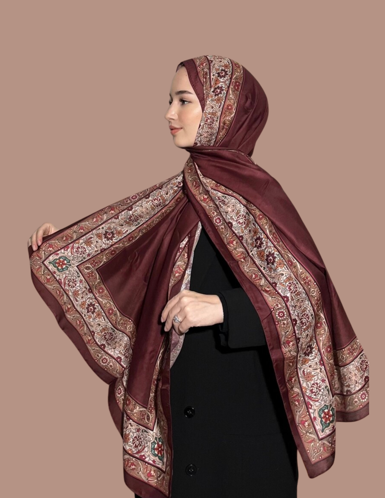 This hijab’s intricate border design and luxurious fabric make it an essential piece for any occasion, whether casual or formal.