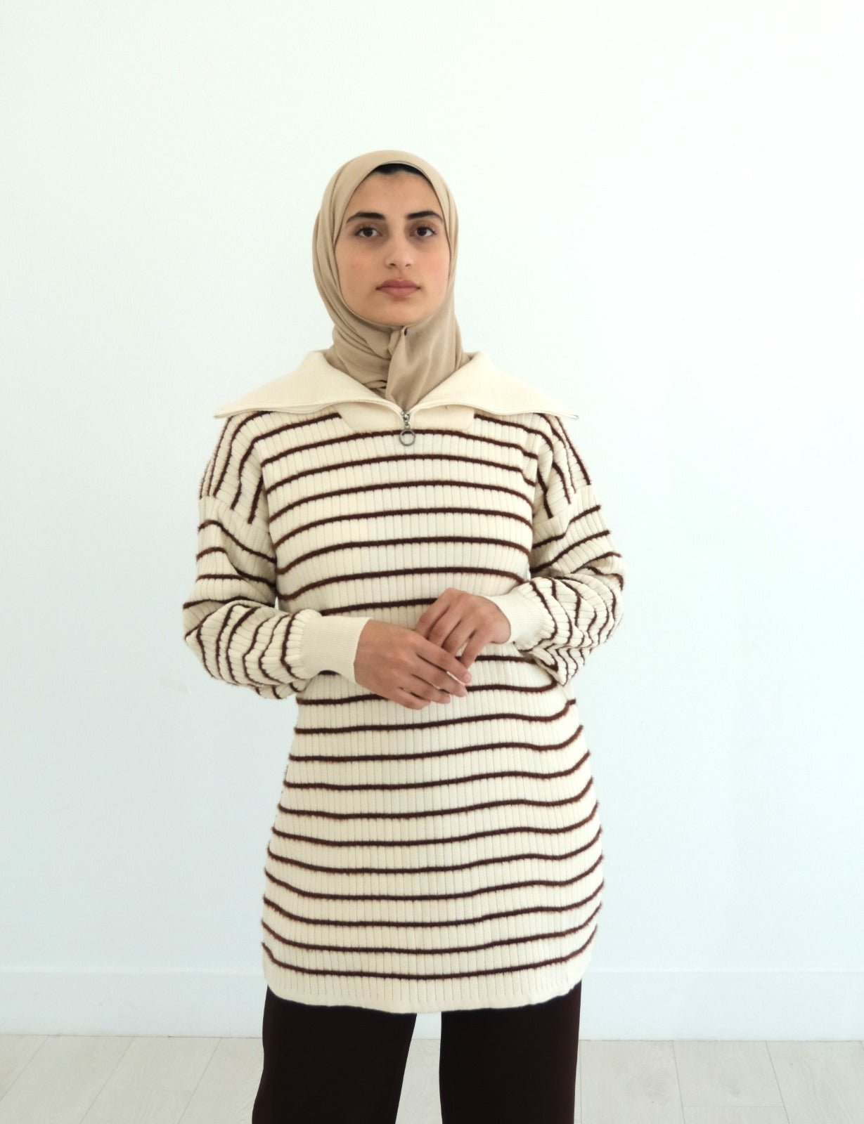 Meet your new cozy staple — a soft knit tunic featuring a chic zippered wide-collar detail and timeless horizontal stripes. Designed in a loose, one-size silhouette that drapes beautifully on every body, it’s long enough to give full bum coverage while keeping things effortlessly modest. Throw it on with your favorite jeans or leggings for a look that’s comfy, elevated, and perfect for everyday wear.