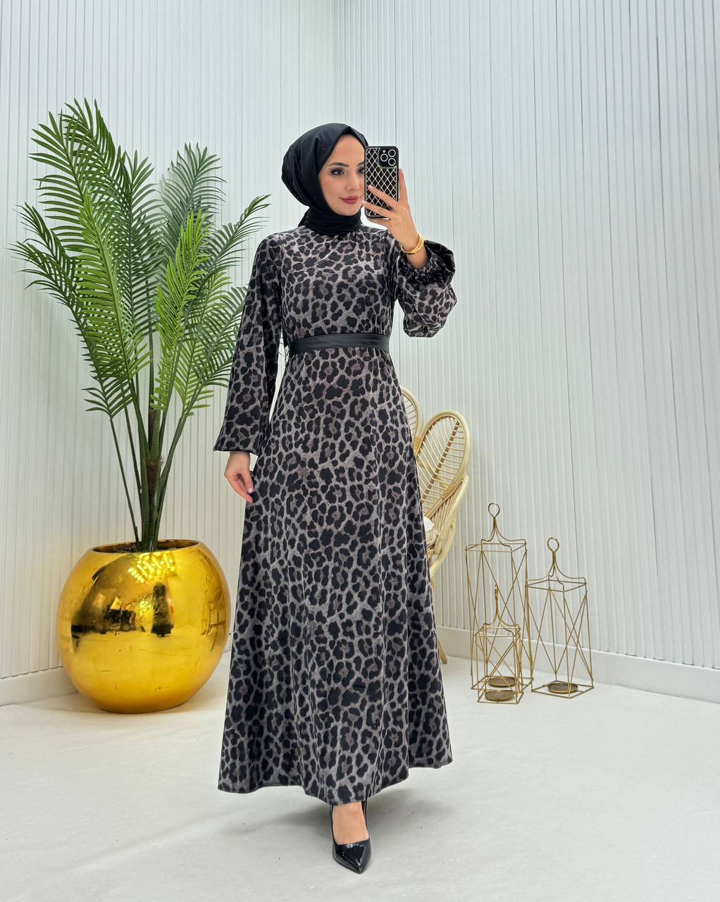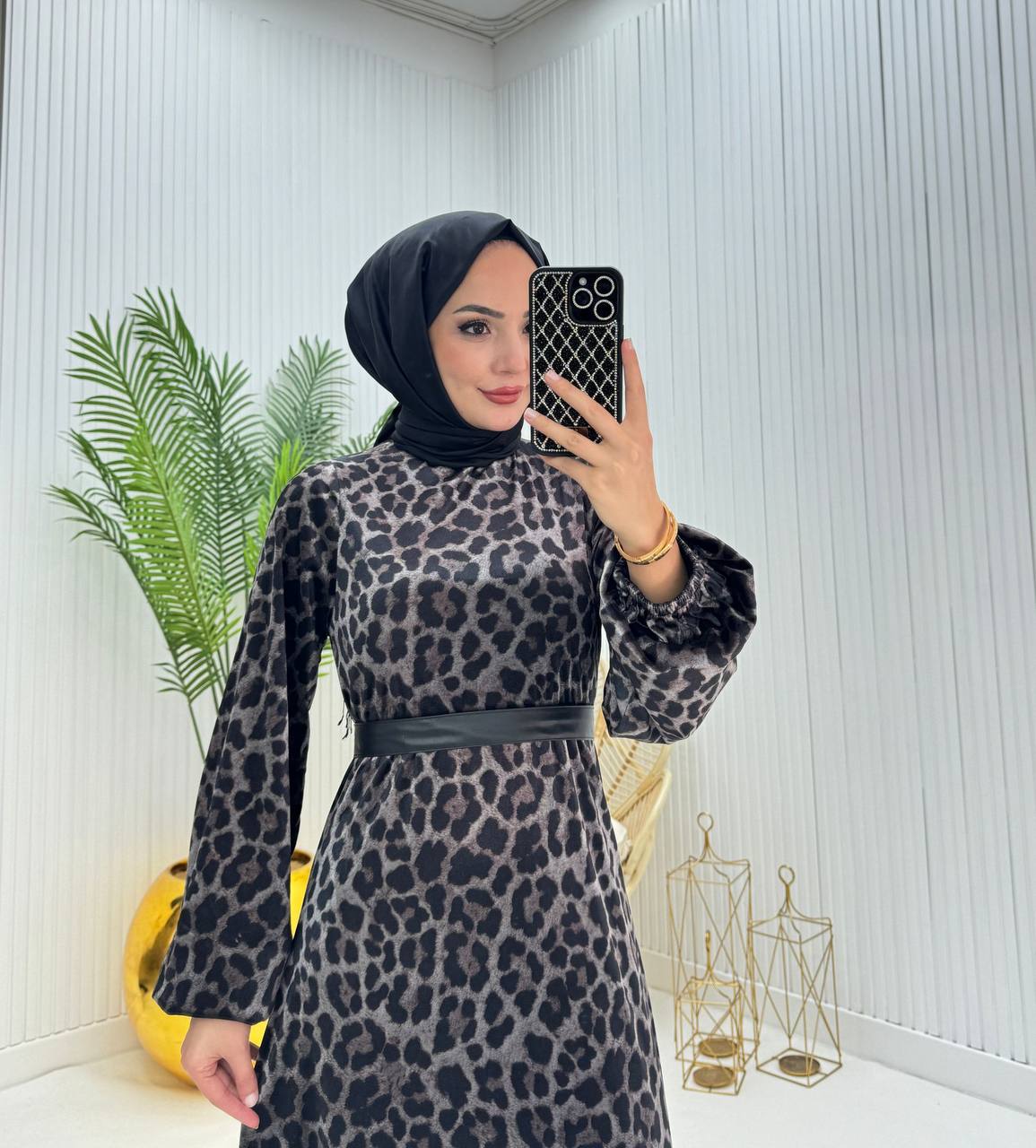 Make a bold statement with this stunning leopard print modest maxi dress, designed for the modern woman who values style and sophistication. The dress features an elegant high neckline and long sleeves, offering full coverage while maintaining a flattering silhouette. The soft, flowing velvet fabric ensures comfort, while the sleek black leather belt cinches the waist, adding definition and a contemporary touch to the ensemble.